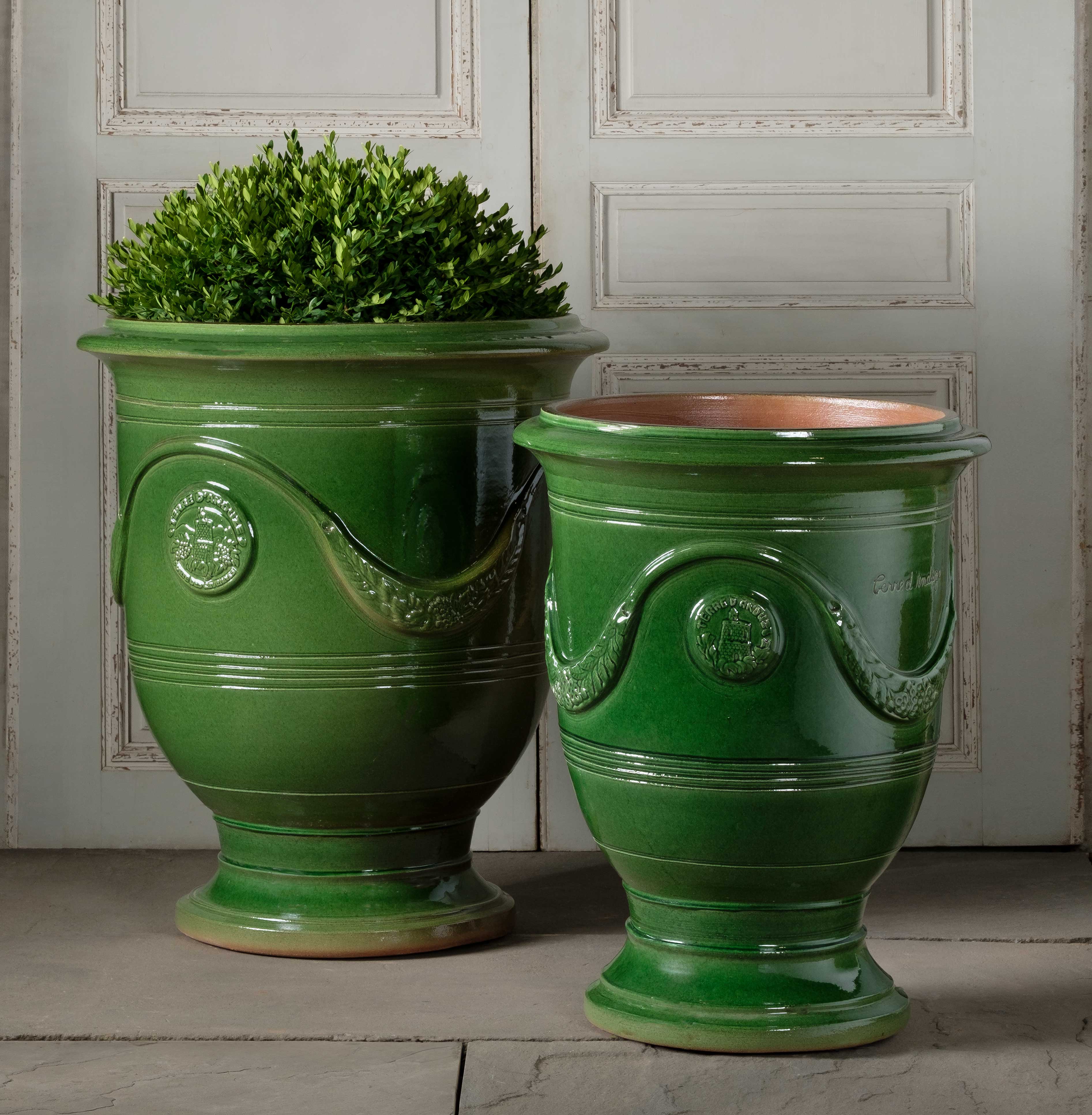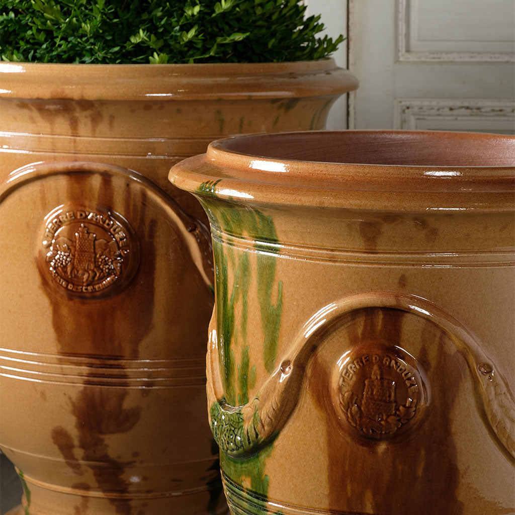 Originally made in a “flamed” glaze of green, brown and yellow striations, these vases were decorated with heraldic shields and garlands of flowers set off with horizontal banding. Beginning in the 17th century, Anduze became a center of production of this now iconic planter and has been home to many great dynasties of potters and earthenware makers. Produced in a rich variety of colorful glazes, this classic and elegant planter can be found in the gardens and orangeries of the great chateaux and residences throughout France.