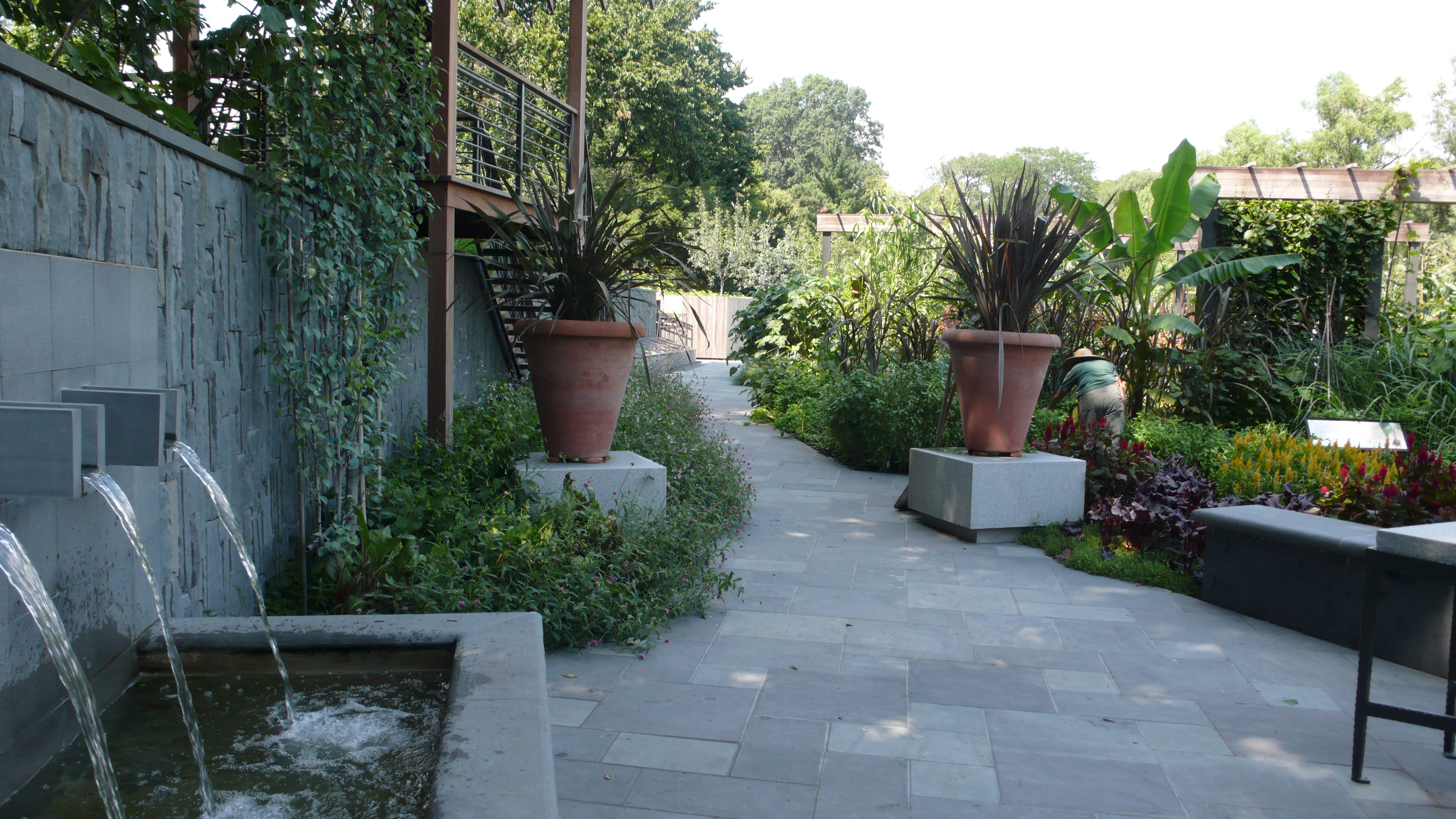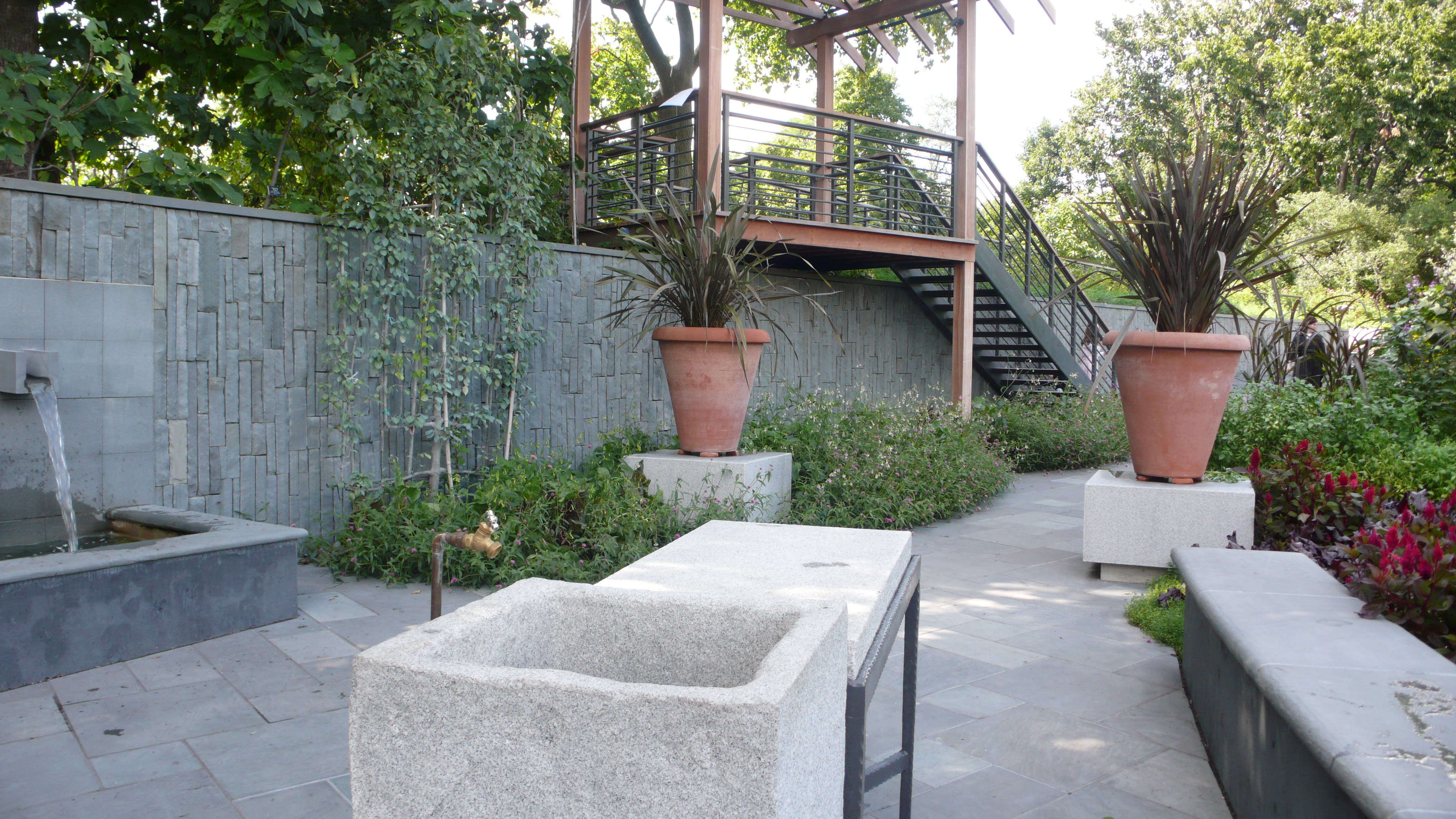 Designed to be both decorative and utilitarian, the project includes a fountain, a stone sink and table, and an observation deck that offers sweeping views of the entire garden. Dispersed throughout the garden are Seibert & Rice Alto Vases and Grey Cubes planted with banana trees, and New England flax.