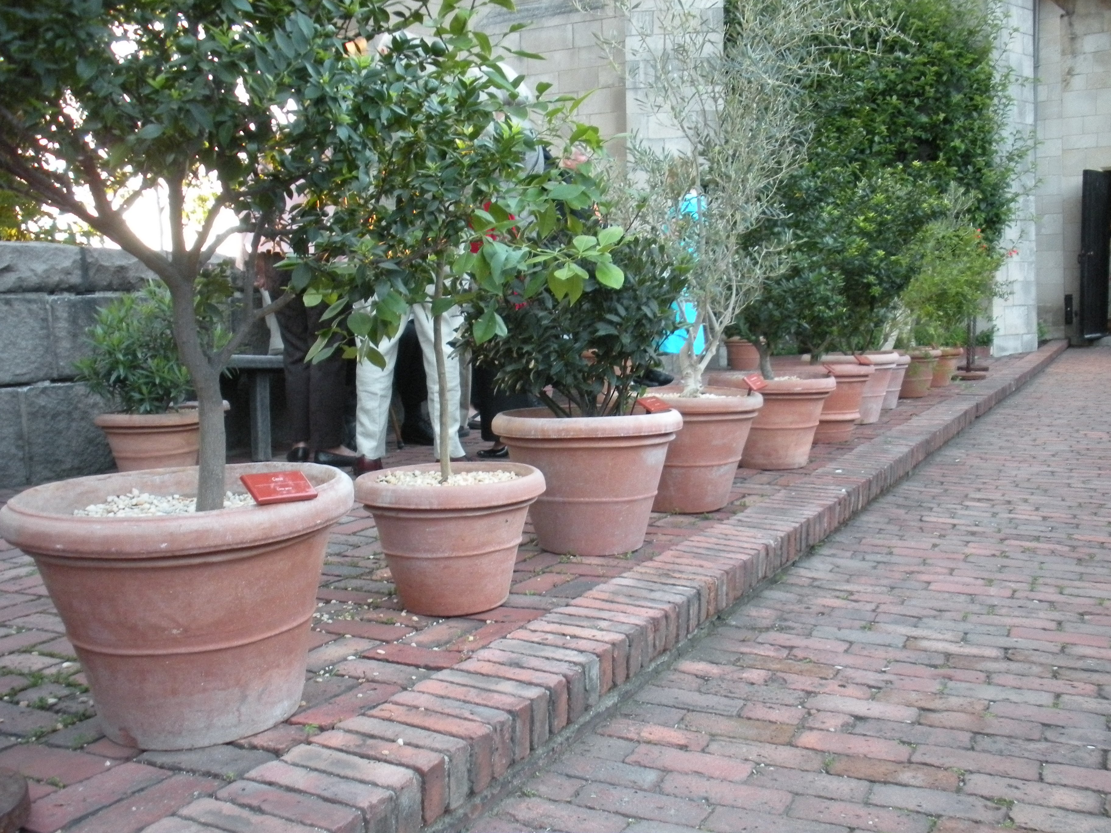 At the heart of the museum is the Cuxa Cloister and Garden. A typical medieval garden, the Cuxa Garden is divided into quadrants with crossed paths and a fountain at the center. Smaller Seibert & Rice Artisan Rolled Rims planted with topiary sit along the low stone walls between the pink marble columns around the garden.
