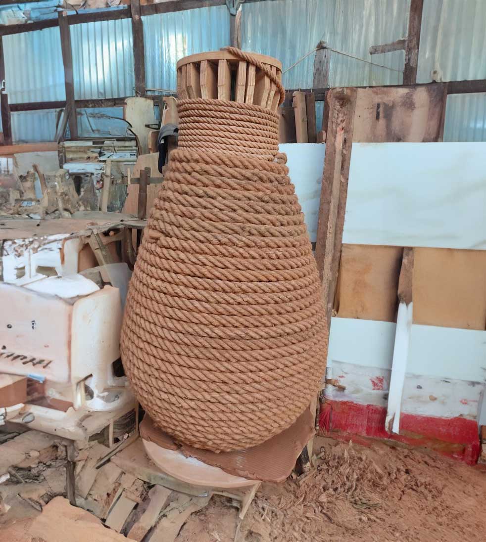 Using traditional artisanal techniques to create the Biot jar, the potter sets up an internal wooden mold know as a “skeleton” which can be assembled like legos. A hemp rope is wrapped around the wooden mold. The clay is then hand-pressed onto the rope from bottom to top to form the jar shape. The outside of the jar is then smoothed by hand and the lip added.